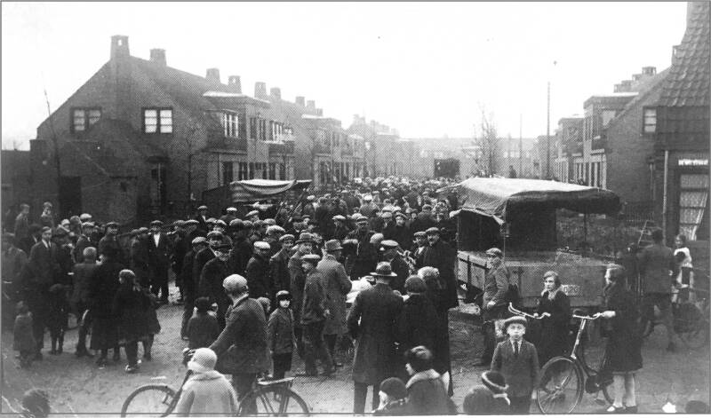 De Witstraat waar een keer per jaar de verlotingsmarkt 'poggenmarkt' werd gehouden. Het was een drukte van belang en er werden ook biggen verhandeld. (Hoofdprijs was een vet varken.)