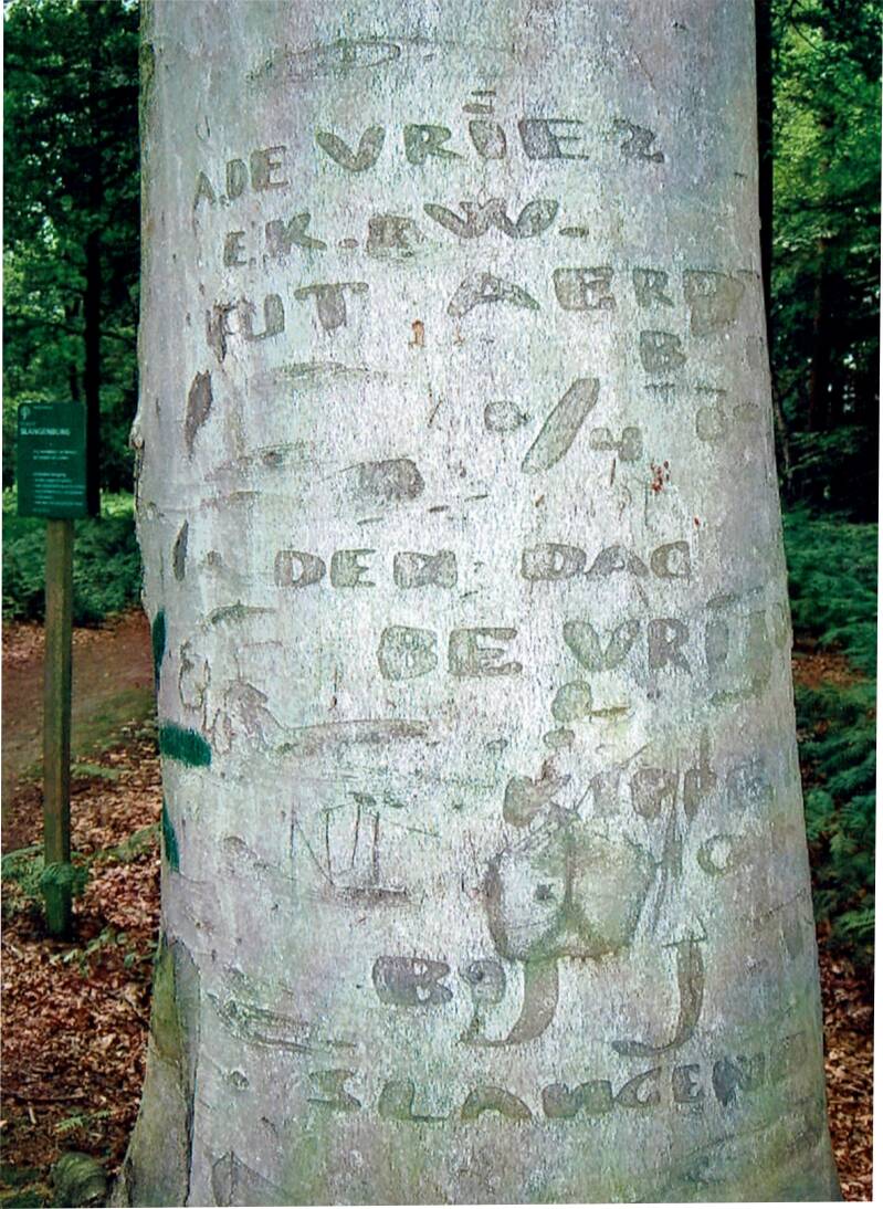 IN EEN ANDERE BOOM IS EEN HARTJE MET PIJLTJE 1945 GEKERFD, MOGELIJK EEN LIEFDESVERKLARING.