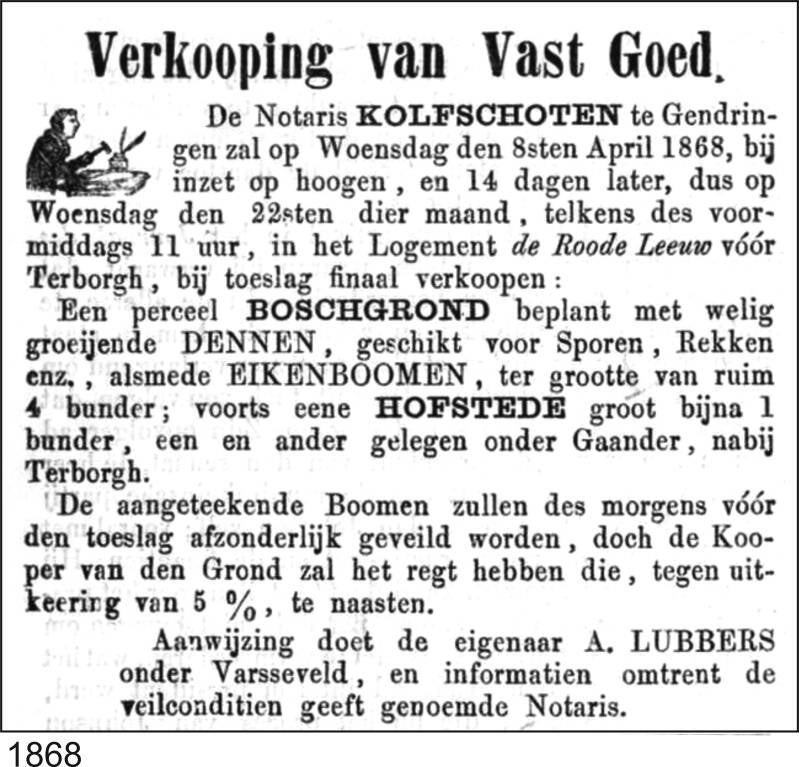 1868: Te koop: Perceel Boschgrond beplant met welig groeiende DENNEN.